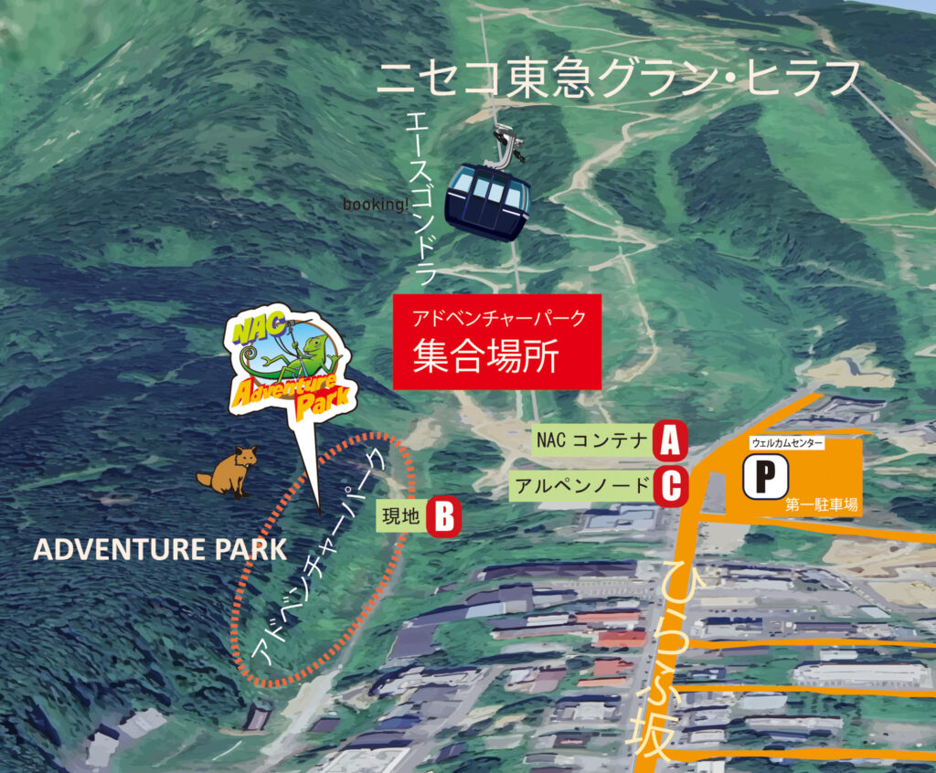 アクセス・集合場所について当パークはニセコグラン・ヒラフスキー場「エースファミリーコース」に隣接しています。期間により集合場所が異なりますので以下をご確認ください。A4月4日~5月6日NACコンテナ(.BASE前)B5月7日~7月3日NACアドベンチャーパークC7月4日~11月3日Alpen Nodeご予約時間の20分前を目安にお越しいただければと思います。
